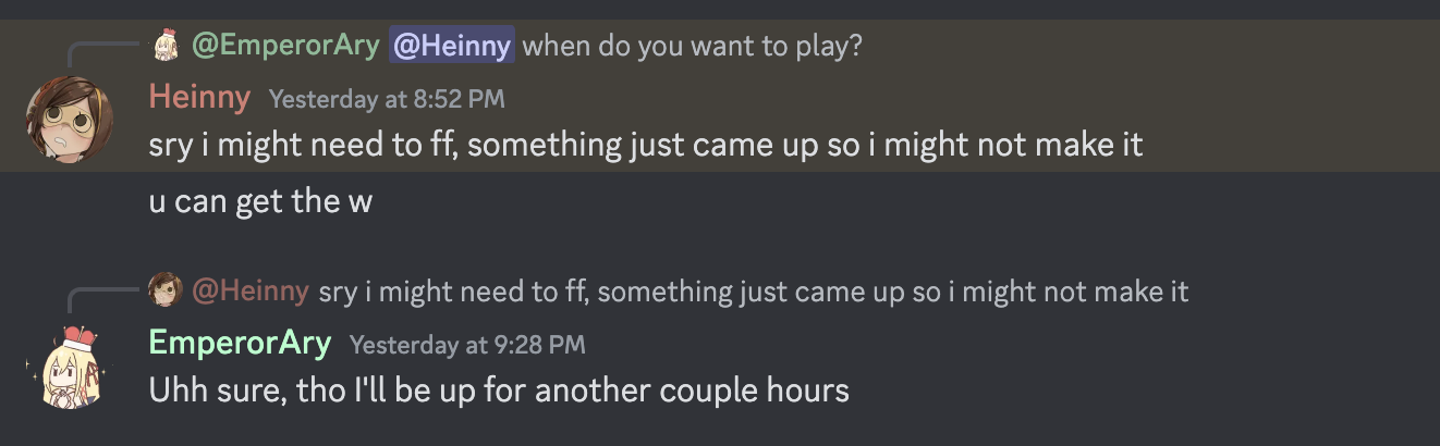 TwentyTwan Apr 28, 2024 #155 I'd like to call act again E1i, added our comms via discord as images. He did try to contact me today but alas I had other plans.