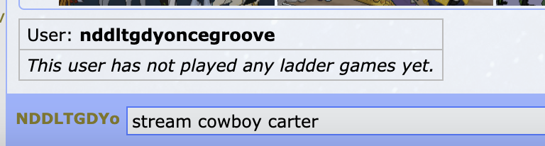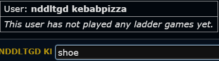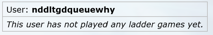 - In keeping with OLT and other ladder tournaments, all ladder games involving a player with a NDDLTGD prefix are now forced to be public. If you have the "Don't allow spectators" box checked when you start a NDDLTGD game, your game will be public and you will be met with this message: "This battle is required to be public due to a player having a name starting with 'NDDLTGD'."