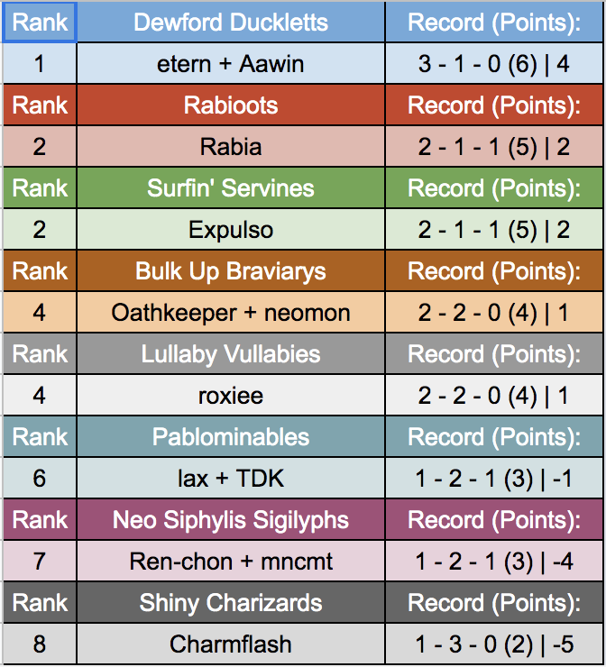 Ggs Charizards, boa sorte Brazil. It's very cool how close the standings are for this tour, I'm excited to watch the next few weeks of games. This is a huge week for pretty much every team and last week the lower-ranked team won 3 of the 4 series.