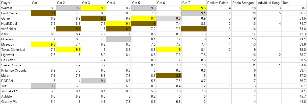 Tomorrow I'll have a post with all the playlists and some writeups. But congratulations to Walrein for barely holding the lead. Thanks for your submissions, everyone! I've gotten something good to look into from each of you.