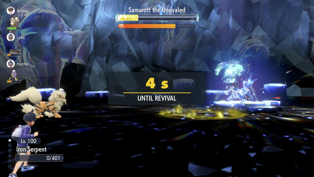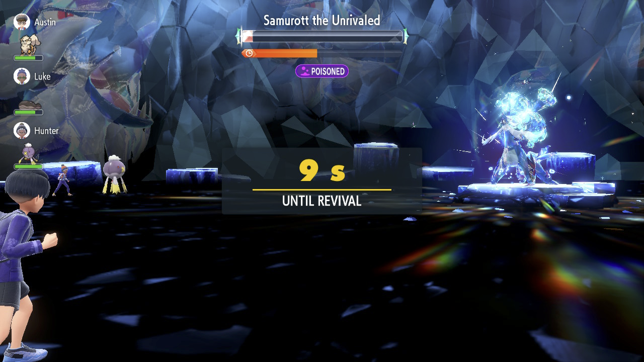 These players were great. The two supports seemed to debuff Samurott and then used Helping Hand for Tera Electric Bellibolt and me. I even botched the Throat Spray timing and we still cruised, also because the supports had timely heal cheers.