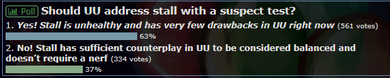 I think the debates are kind of getting circular at this point, so let’s put it to an official council vote. To reiterate, there’s a strong push to do something about stall on the NP thread and in the UU room, with pif largely leading the charge. Not going to reiterate all of the pros and cons, but if you haven’t already, read his posts and the various responses. The basic argument is that stall is simply too consistent and reliable now, and that there are very few drawbacks to running it versus other playstyles.