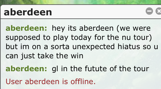 [22:00:41] ManOfMany23: I might as well just forfeit then
