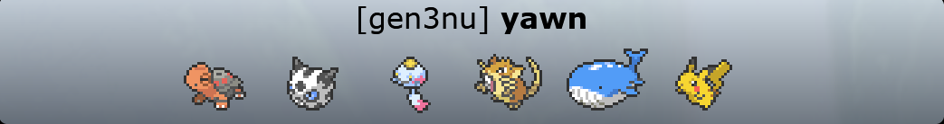 i asked my team again what to build LMAO and Bouff gave me 3 to choose and i chose torkoal - feen gave me cacturne but i decided it was IMPOSSIBLE to build with what i had in mind so i decided to rng the last mon (pikachu) and name it feen in honor of my failure... tbh i had a mawile>chimecho but i really didnt like the feel of no flying/levitate mons so i opted for yawn-phasers over bp. it gave me a good deal to work with considering i had torkoal lead. i didnt get to reveal this wailord set at all when i played so i decided to use it again and to also be a sponge for other waters. lastly i needed something for haunter and other berry sweepers so i decided on silk scarf raticate because fastest mon in the tier + shadow ball + potential surprise factor. now taunt is honestly an 'eh' option but i kinda needed it here because of pupitar - i kill something and it sets up in my face otherwise. with taunt i can at least not let it +1 and it actually worked out in my game LOL. glalie best mon.