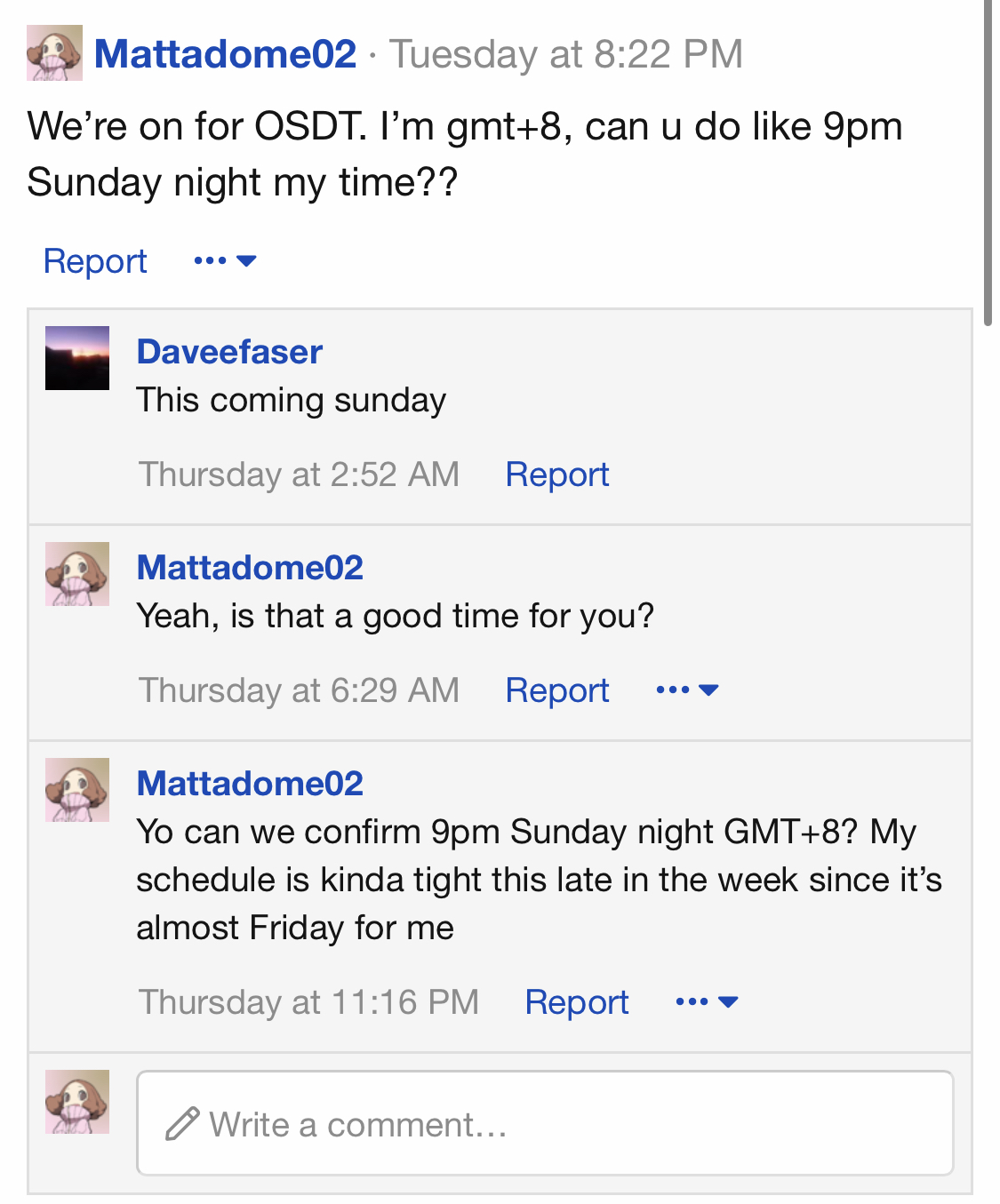 Contacted my opponent with a time, received an acknowledgment but no schedule from them or confirmation of availability as of this post.