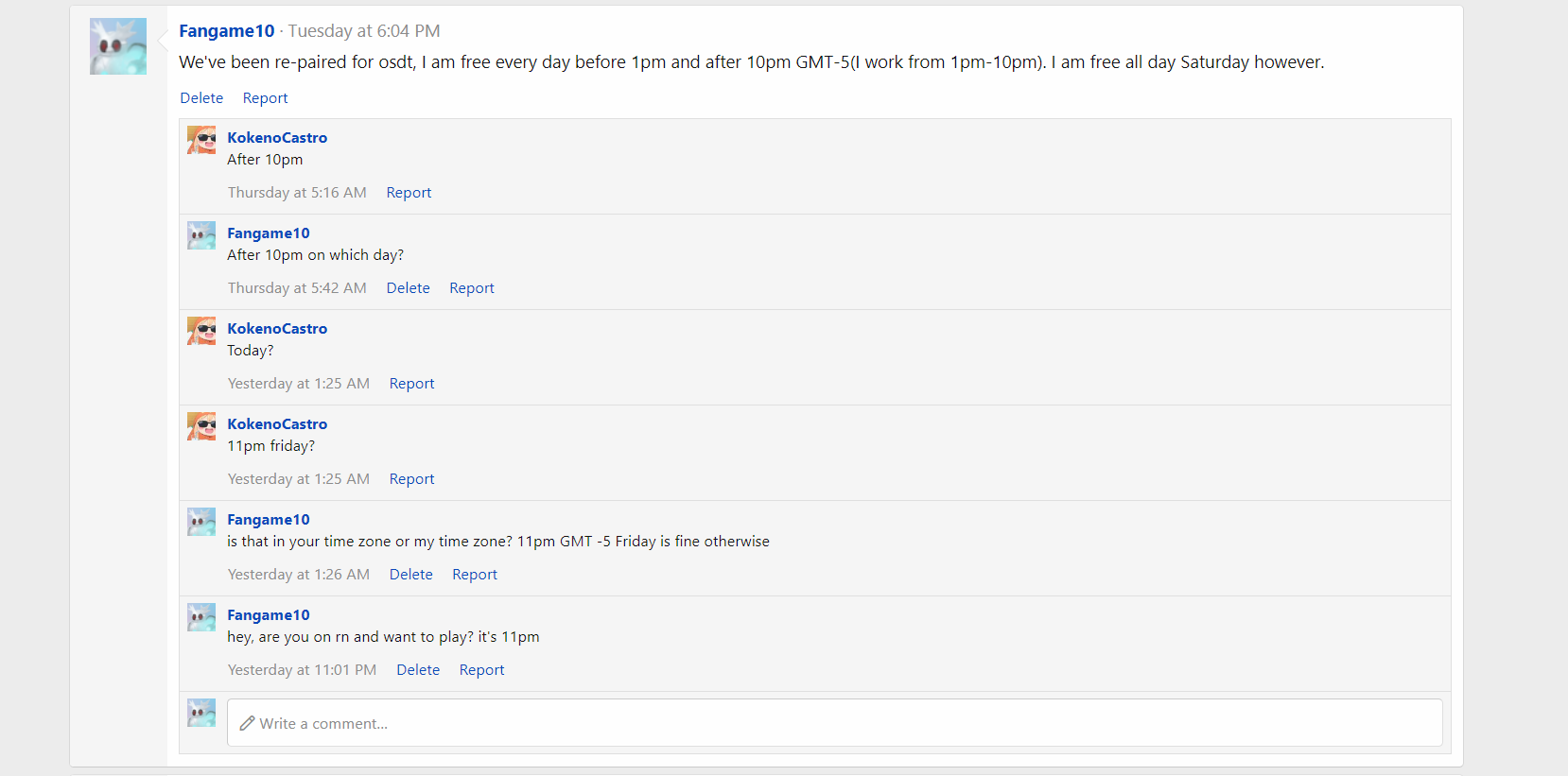 Calling Act, has been 1 hour since our set time of 11pm GMT-5, opp has been very slow to respond to me with scheduling plans and never showed up at the time they suggested (or clarified which timezone it was)