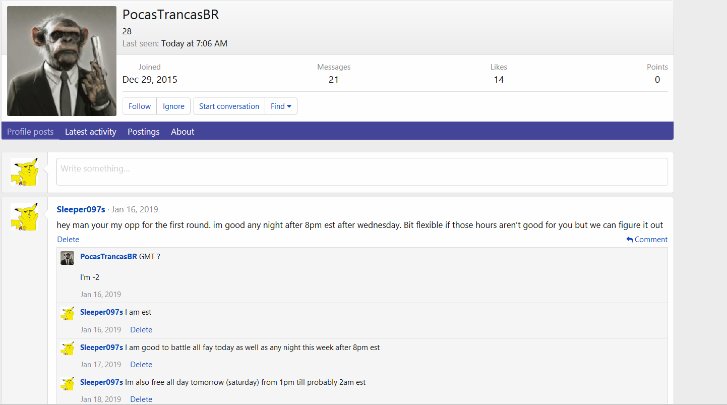 Activity win request, I have been checking every day to get a time with my opponent (PocasTrancasBR) but It looks like hes been too busy to play or just hasn't responded to me . attached you can see the multiple attempts, as well as messages at times I believed he would be awake like early morning, and records saying he logged in today but didn't respond. When he said he was on I logged on and he was in a battle then after he said something came up then logged out. That I have no proof of as it was in a message on the pokemonshowdown website.
