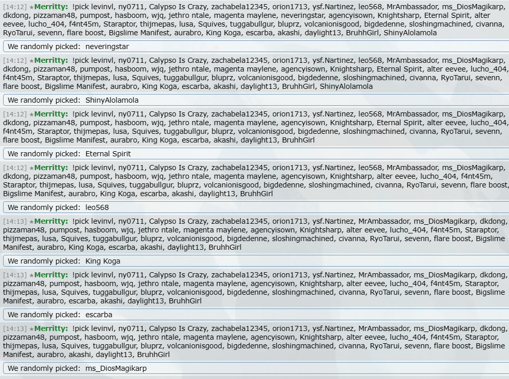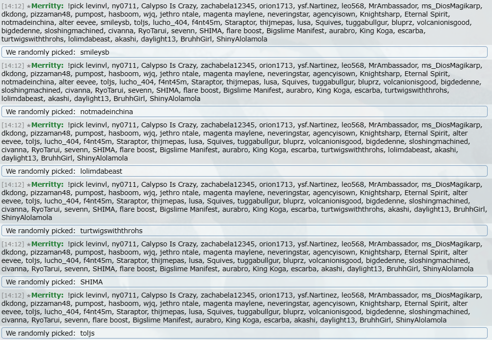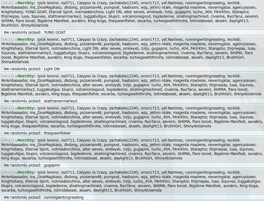 levinvl, ny0711, Calypso Is Crazy, zachabela12345, orion1713, ysf.Nartinez, runningwritingreading, leo568, MrAmbassador, ms_DiosMagikarp, dkdong, pizzaman48, pumpost, hasboom, wjq, jethro ntale, magenta maylene, neveringstar, agencyisown, Knightsharp, YUNG GOAT, Eternal Spirit, notmadeinchina, Light DN, alter eevee, smileysb, toljs, gugapmr, lucho_404, f4nt45m, Staraptor, thijmepas, lusa, Squives, stattrainermarley2, tuggabullgur, bluprz, volcanionisgood, bigdedenne, sloshingmachined, civanna, RyoTarui, sevenn, SHIMA, flare boost, Bigslime Manifest, aurabro, King Koga, thequeenfisher, escarba, turtwigswiththrohs, lolimdabeast, akashi, daylight13, BruhhGirl, and ShinyAlolamola are all subbed out.