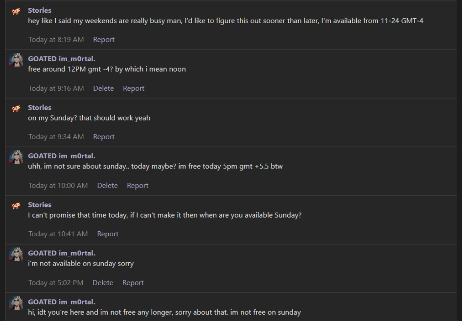 is it my fucking fault you asked for abysmal times? lmao its crazy how people think they can claim act just b/c they were more active in scheduling OR what it really is - suggesting inviable clown times. i have no intention to claim an act vs you, b/c i know you will get steamrolled. if the hosts will provide an extension im more than happy to play you. crazy how people think they can get away with anything just b/c they're a moderator in a discord sobI guess I have to call activity as well, I really wanted to play but I reached out literally Tuesday 3 AM to no response then again on Thursday saying I'd like to schedule bc my weekends are busy, he then proceeds to wait until said weekend to propose exclusively my mornings which i said dont work. we manage to come to a time that could potentially work and i tell him that time would for me on Sunday and now he magically isnt available on Sunday the one day I could play in the morning. every time i proposed was just a "nope" with no alternative forcing me to do all the legwork when scheduling