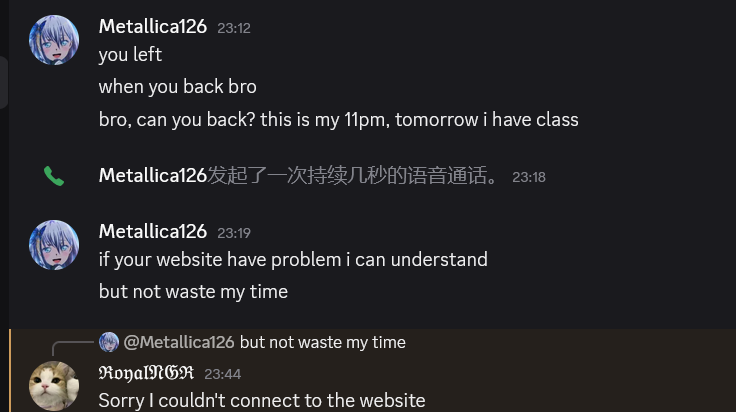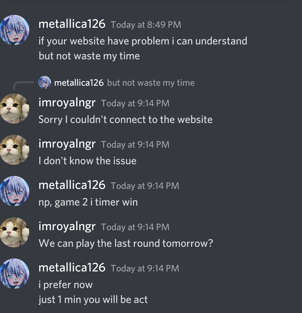 And you are just imposing the act when I asked you if we can play the last round tomorrow. You preferring the time just now shouldn't mean you can act on me when I couldn't even connect to the site earlier.