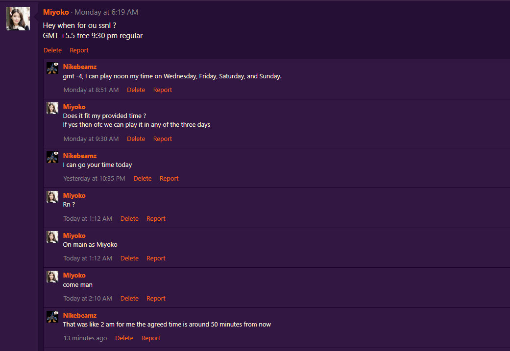I am really confused you said you were available at 930 pm your time (noon my time) on the four days provided (including today). I said last night that I was down for the agreed time on Sunday and then you tried to get me to play at 1-2 am when I was not online.