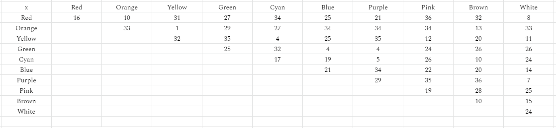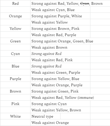 Looks meaningless, right? Don't worry, I'll explain and show what this all means in another picture. Each number is generated between 1 and 36. The types on the top are attacking and the side are defending. If a number is 1 to 6, that's a strong matchup. If a number is 31 to 35, it's a weak matchup, and if it's 36 then the defending type is immune. It's cut in half so that if a type beats another type, it does so both offensively and defensively so the types that are meant to check others can truly do so. If Red beats Green offensively for example, then Red is super effective on Green AND Green is resisted by Red. Also, as a sort of failsafe to prevent anything too insane, I made it so that if a type has no winning matchups, they're manually given a winning matchup against the type with the least losing matchups relative to their winning matchups, and vice versa. In addition, the tenth type (White in this case) is meant to be a neutral type if possible. There will be universally-learned moves, and most of them will be given this type.