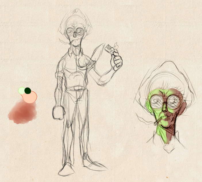 Character design exercise with more exaggerated shapes and features to convey character (aka me speakey the shape language) with a bit of a pass at a colored light source