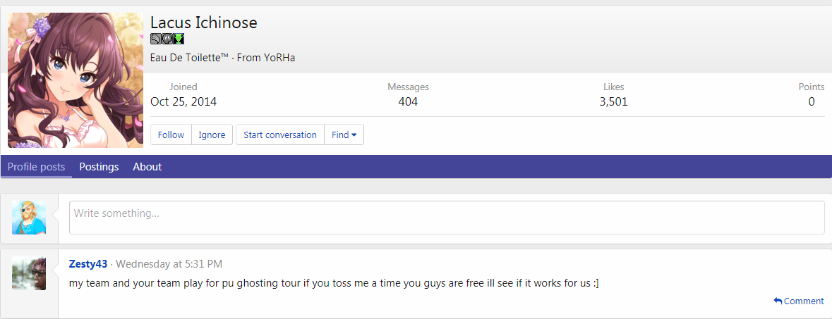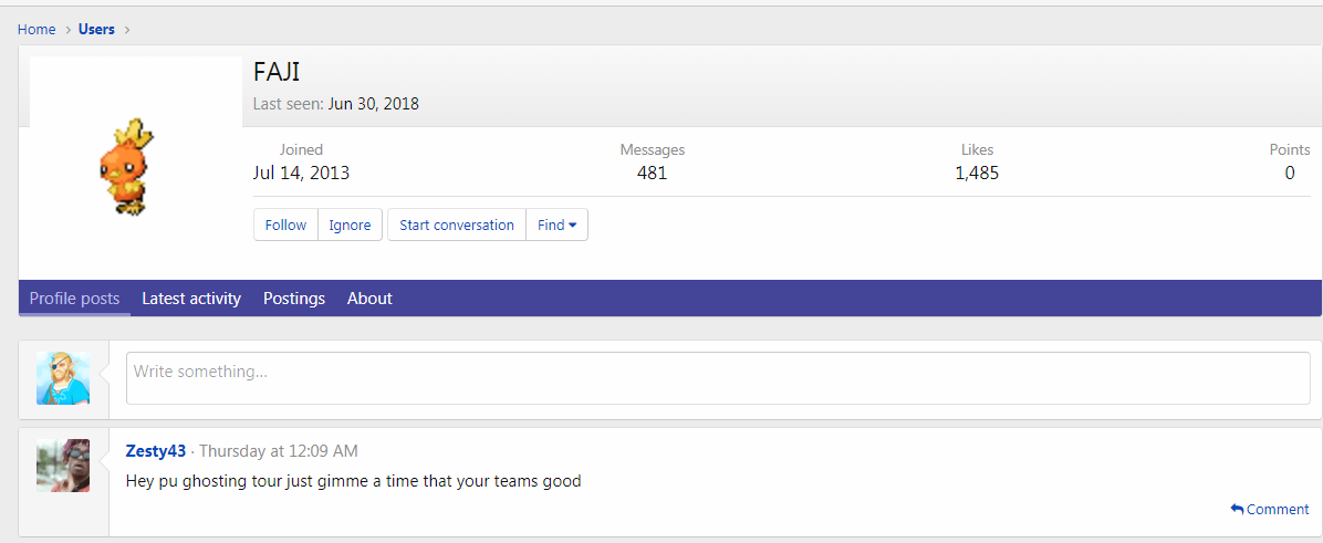 Activity post. My team (aka Zesty) has messaged two different users from our opponent's side and neither one of them has responded. Faji, in fact, hasn't been on Smogon since June. They have made no attempts to write anything on our profiles nor reached out to arrange anything and all 3 members of our team are busy with school this week + vastly different timezones are gonna make it hard to arrange something so last minute.