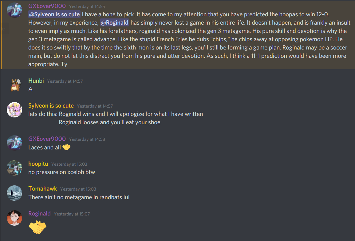Even though it pains me that HOOP HOOP does not 12-0 this week I still have my honor. I will apologize for writing that the best Team, Team Hoopa, will 12-0 Team Big Feesh this week. We would never be so rude to humiliate Team Kyogre in this way. In other words, Roginald winning this week only points out our generosity and dignity.