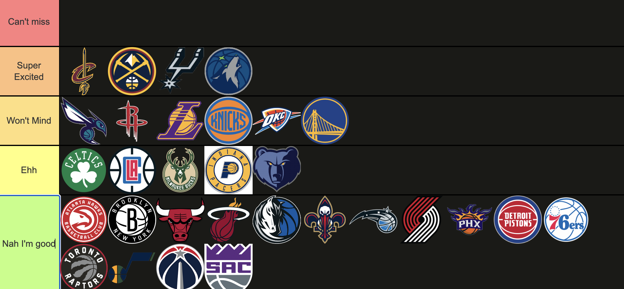 My ranking of how much I'd like to watch an NBA team on a random Tuesday night: