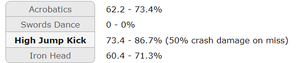 having it´s speed turn 1. Maybe I should switch it because of this fact,maybe something else does the job as a Setup-Swepper better. Sky Attack triggers my Unburden (in combination with Power Herb) and has some nasty Damage output. Swords Dance as a setup option and High Jump Kick and Acrobatics as your primary Damage source.