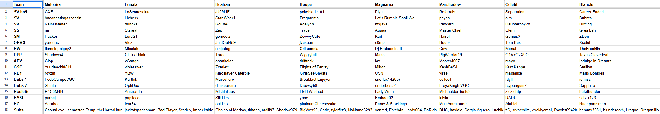 Overall, I think the Meloetta's had a pretty solid draft and I think it is likely they are in playoff contention. Consistent high level players in pretty much every main tier and good, flexible options for tiebreaks as well. Subs have excellent flexibility for slotting wherever needed. I think the weakness lies in the more uncommon tiers (HC, BSSF, Roulette); if these players can stand up to the challenge, this will be a tough team to beat.SV (bo5): LoSconosciuto