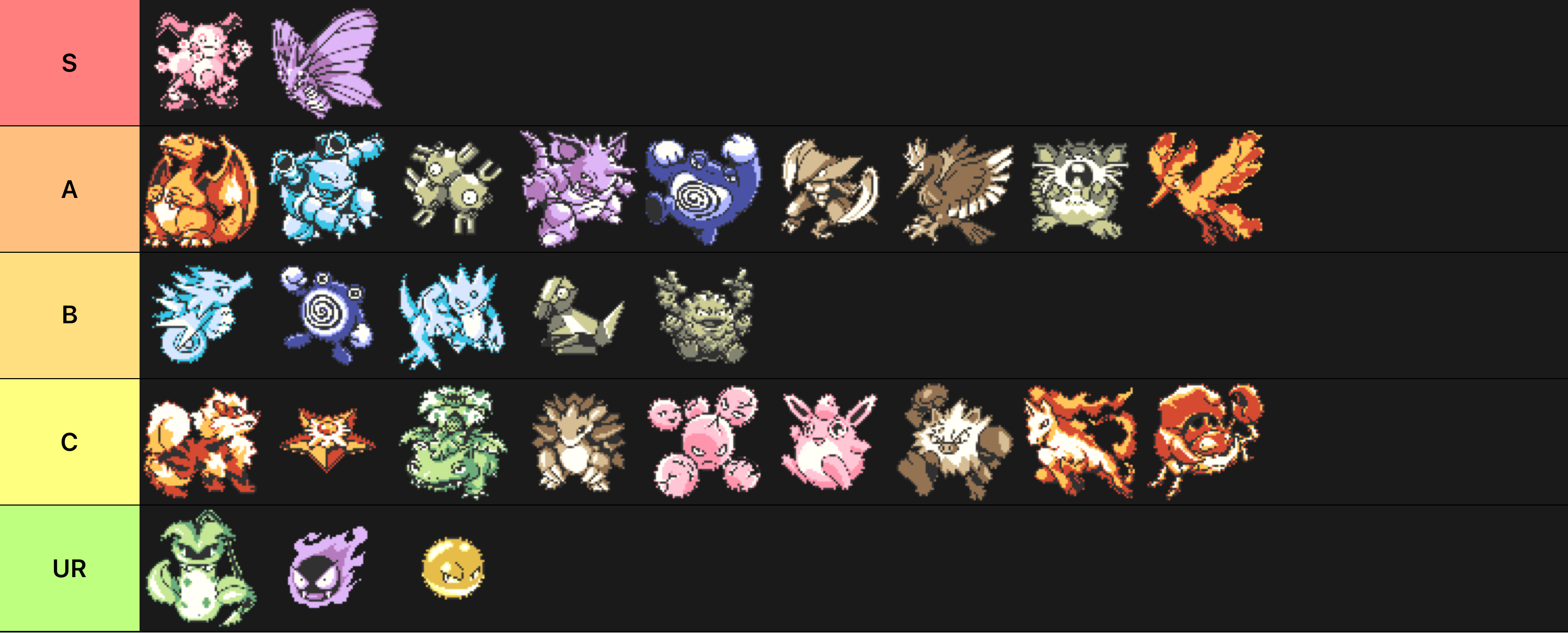 Moltres I used only a couple times towards the end of the season but I actually have really liked it. Great special bulk lets it be a legit positive trader vs mime, and is the best Pokemon you can switch into venomoth. I think people worry a bit too much about the matchup into waters when this thing can very reasonably muscle through them just by clicking its one button. I use rest on moltres because I think the bulk is good enough that you have a realistic shot to clear paralysis vs mime, especially with an agility. SD zard is a concern for moltres teams, but there’s often a line that moltres can help with vs sd zard. For example, Blastoise surf into moltres hyper beam has a very high chance to kill zard when factoring in crits, zard missing hyper beam or critting when it doesn’t want to. The kabutops matchup is honestly the thing stopping me from spamming this mon more, but it is a huge limiter so it stays B tier.