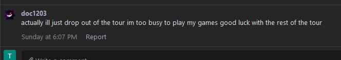 Dropping out, my mental health is at all time low, I'm not playing up to my standards, its becoming more stressful than fun, im at rock bottom, this game is ruining me, I need time to recover and grieve over the loss of my mom, thanks for understanding