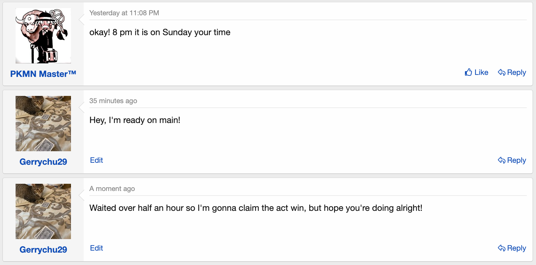 I am ready now. Sorry for the wait.Claiming act win, opponent missed scheduled time, proof on our smogon conversation, screenshot below