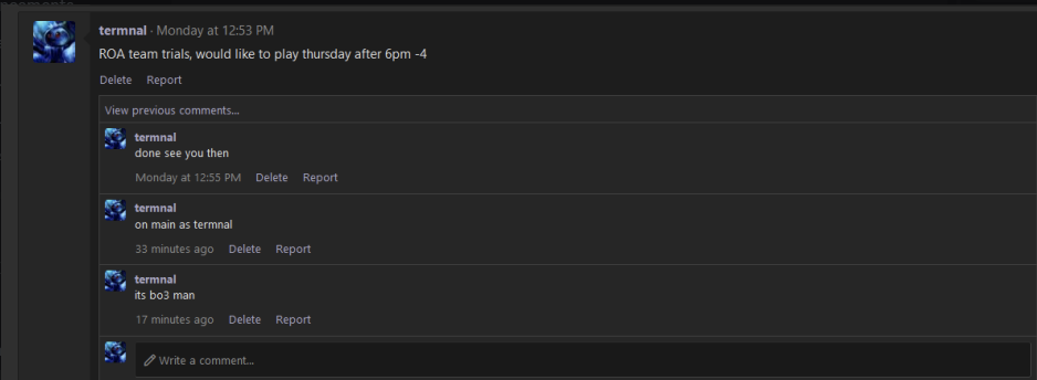 And while it is very unfortunate that act had to occur, the circumstances obviously suck for Welcome Guest, I don't think offering arguments like these on your part makes much sense or shines a very good light. Act calls on Thursday have always been valid in individual tours, especially given Termnal's unavailability this weekend, and Sus said this tour's act rules will mirror an individual tournament (which Just Makes Sense). Secondly, where in the rules does it say anything about time between games? Given Termnal's situation, and the glaring hole in the closest thing to actual codified activity rules on the site, assuming 15 minutes to act was pathologically valid. And, given players are only expected to wait 15 minutes before the first game without warning, why would it be 30 before g2 without warning?
