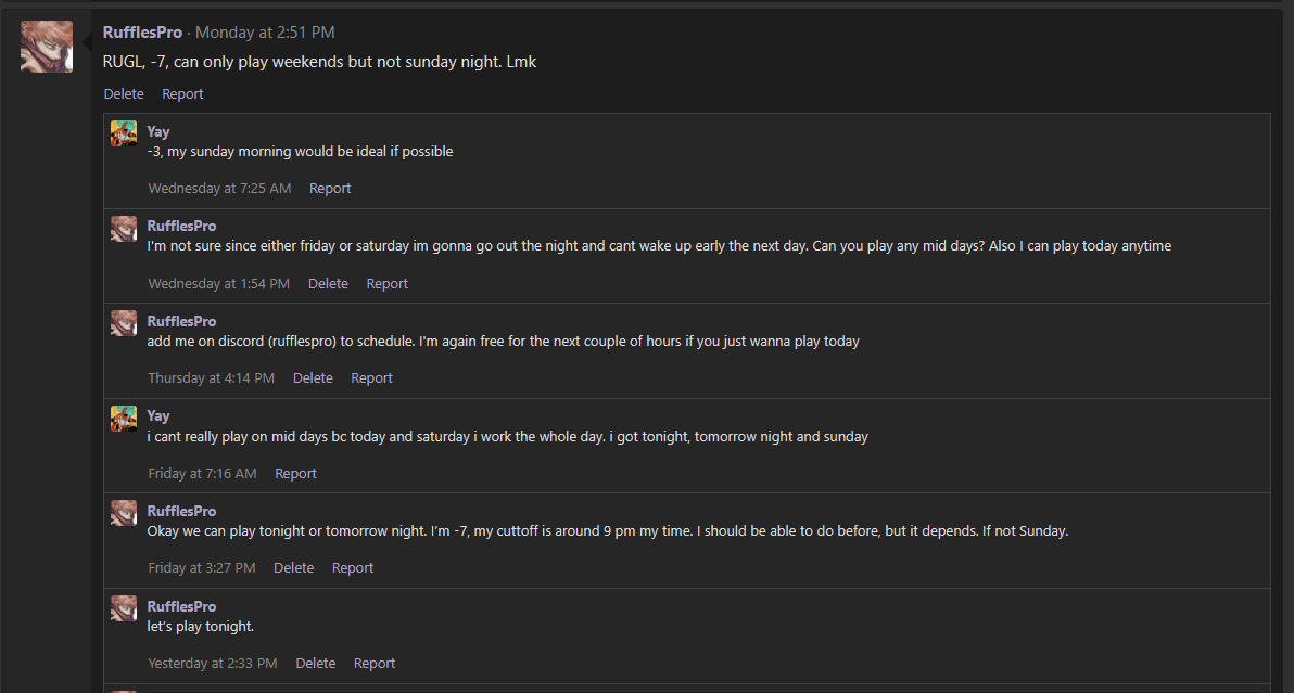 its 1pm ur time you got 8 more hours broCalling act on my opponent. Why tf he is acting like a roaming legendary I cant get a hold of him to schedule at all and it's already Sunday and it's very busy for me I have to go now. I know I said I was available until 9 PM my time but something came up. I attempted to contact him every single day pretty much with minimal response. He said he was available friday night and saturday night, to which he did not show up for either.