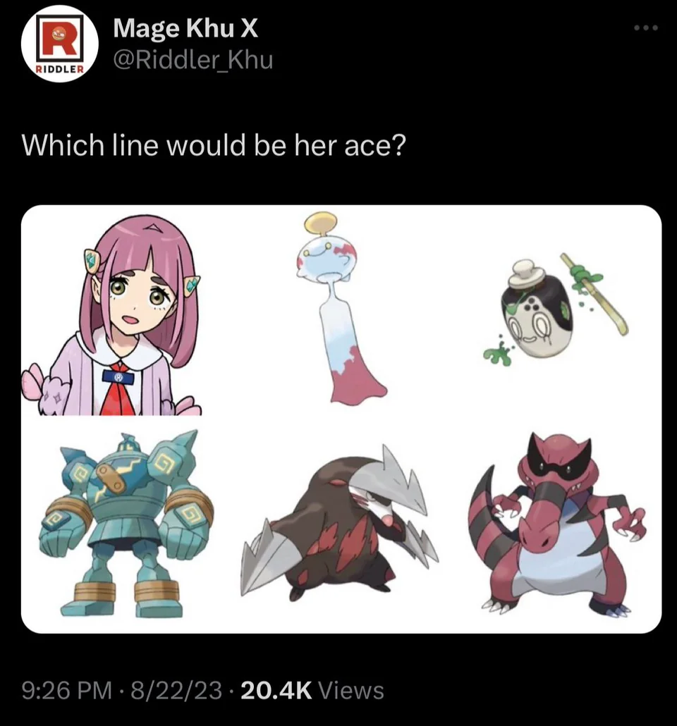 Consider, why would Khu show Chimecho, a notoriously forgotten and rarely used Gen 3 line widely regarded as useless in battle, and doesn't play at all in the ongoing speculation regarding the DLC? It only makes sense if he signalled it out because of it being Lacey's ace, and is getting a Psychic/Fairy evo like people have been asking for. Think of it; the games have been generally very consistent with giving new forms/regionals to new characters in DLC, with Klara and Avery getting the G-Slowtwins, Carmine Sinistcha, Kieran Dipplin and its evo, and Drayton Archaludon, so it would match if Lacey's ace were along the same lines. That's where the evidence seems to point, anyway.