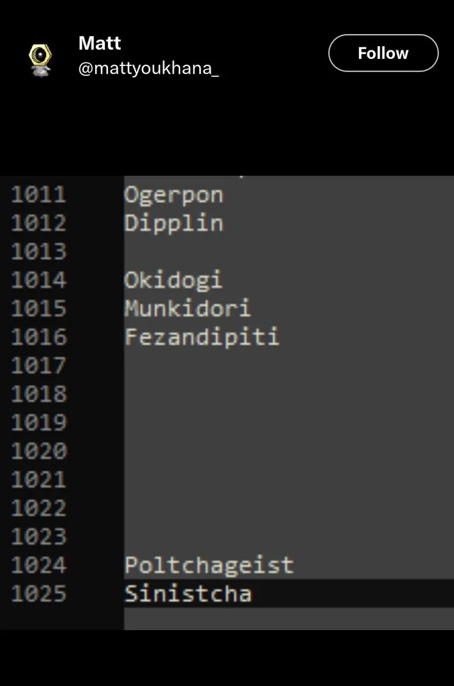 As we all know, dataminers have found that there are eight unfilled slots in the dex, open thanks to the addition of Sinistcha. We know that four of the them are the remaining Paradox Beasts/Musketeers, along with two for Archaludon, and probably Terapagos (though this might be wrong, because it be....odd, to have a cup of tea end the dex). We know also thanks to the Eviolite that the other slot is the Dipplin evo. But that leaves one entry very conspicuously empty. Some have speculated it might be a mythical representing Momotaro, but we now know there is no Momotaro figure in the story of Ogerpon and the Loyal Three, and it appears Mythicals have been discontinued as a result of the movies no longer being produced.