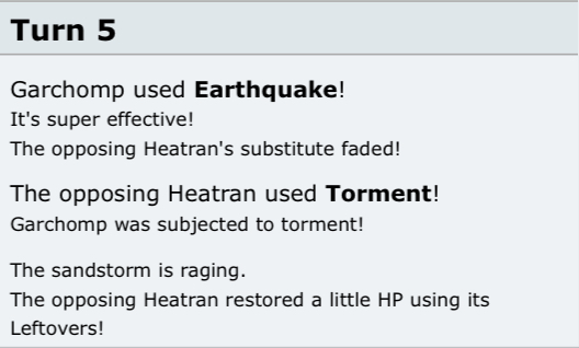 Turn 5: Garchomp uses Earthquake, Heatran uses Torment.