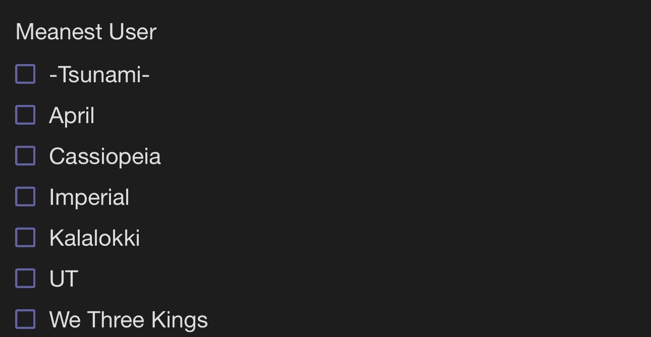 Click the boxes before the names of the users you want to vote for, and when you're done, click "Submit" at the bottom of the page. As a reminder, you can vote for multiple candidates per category.
