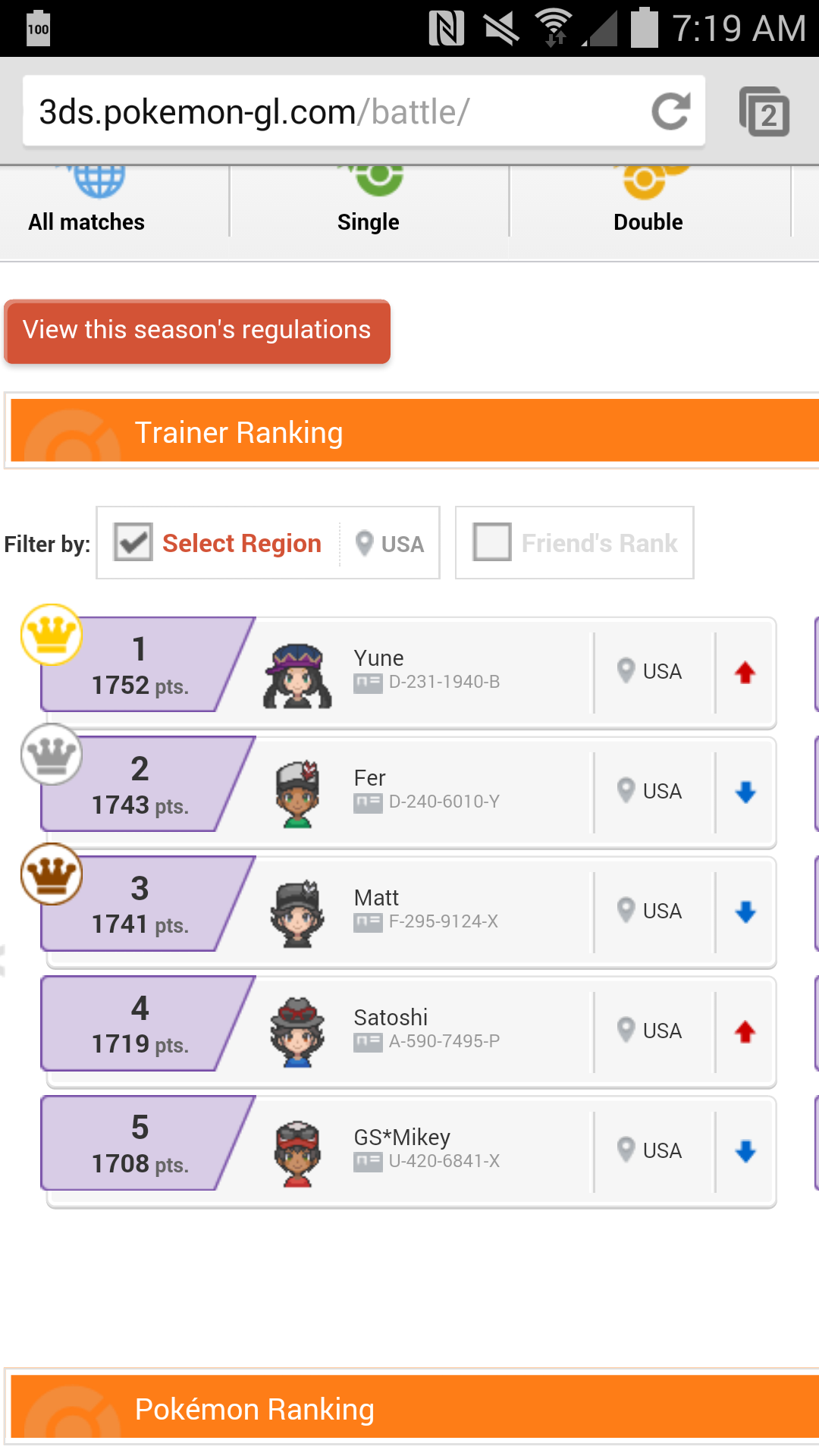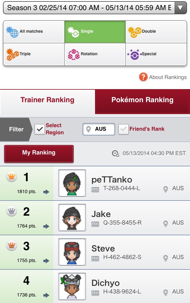 Well it appears as if this is no longer really updated but, I finished 8th (yay my favorite number) in the USA on the special board season 4. Theorymon beat me out with 3rd. I probably could've gotten higher if I had played more, but I got fed up with seeing high ranked Japanese players with shit like moody sheer cold Glalie (I still won, but it just rustled my feathers).