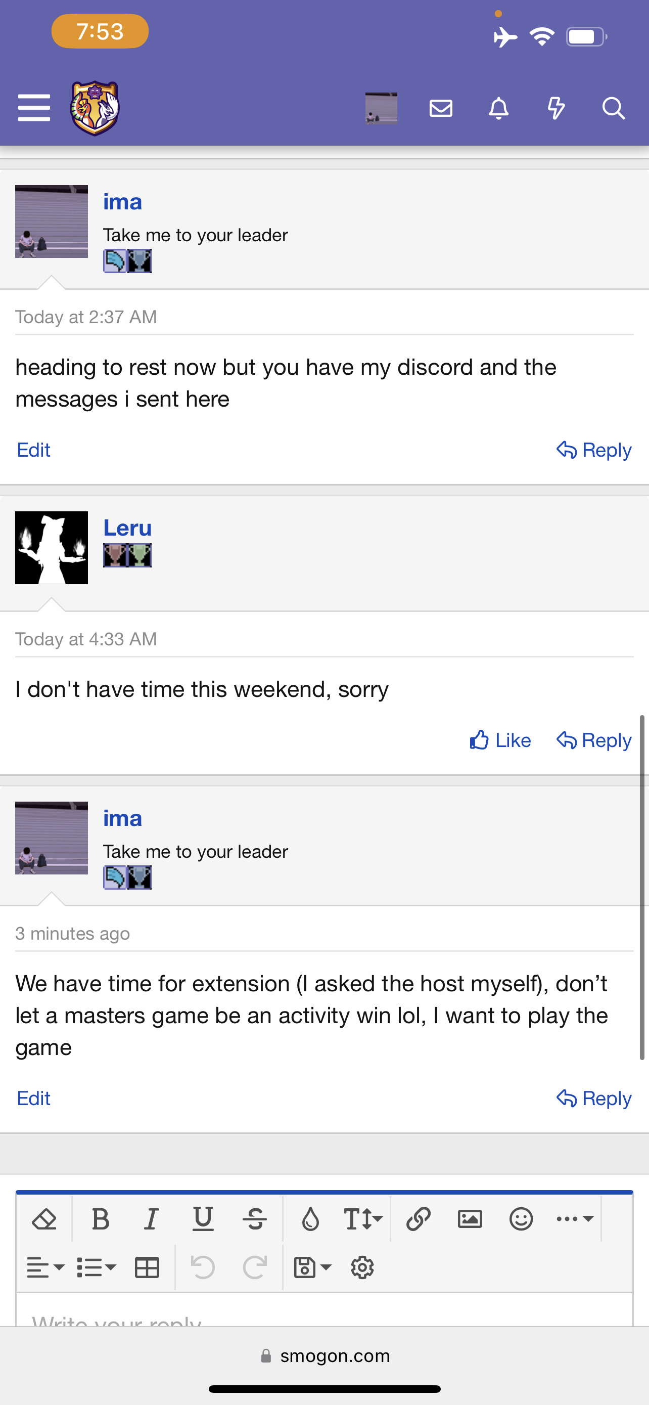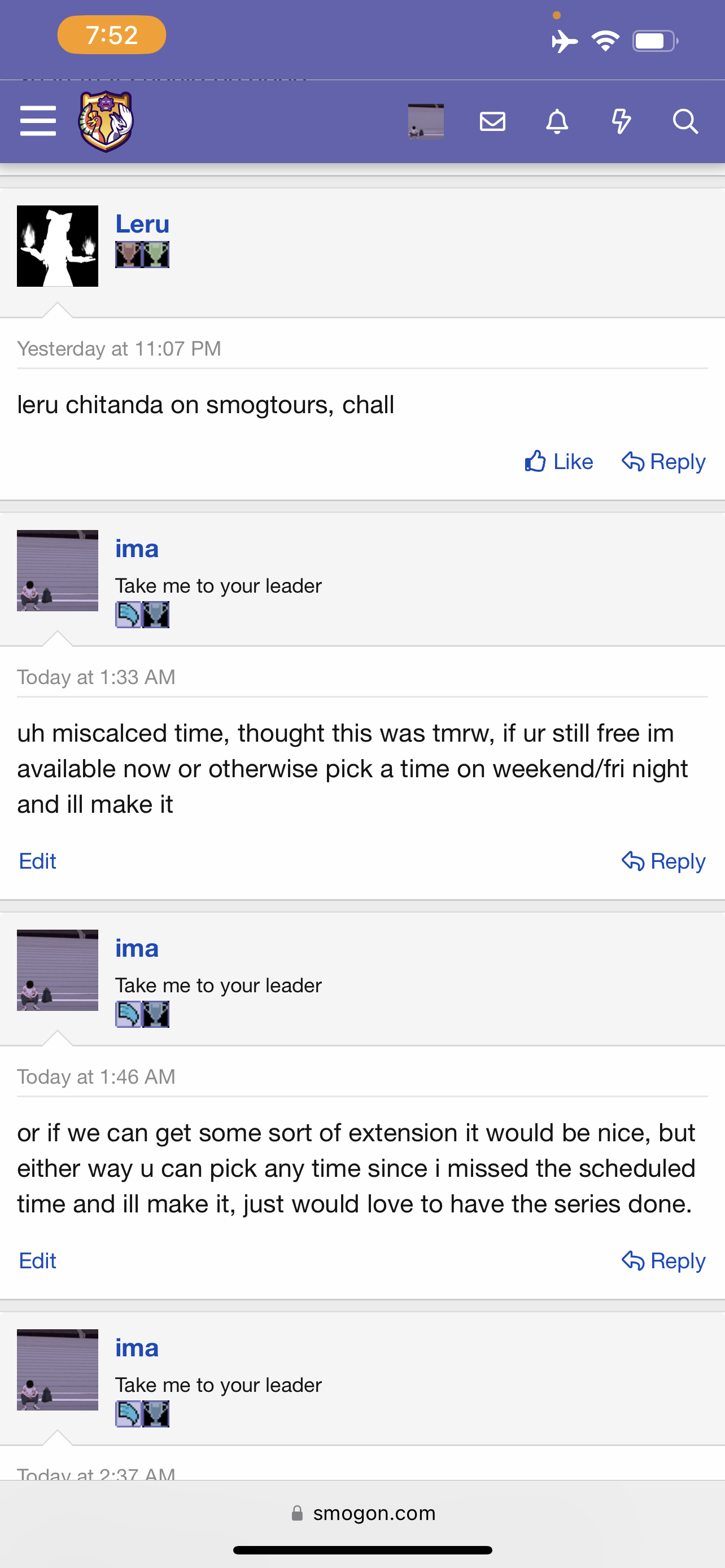 Leru's profile is completely blocked. I cannot message him on Smogon, so I'd have to wait for him to message me back (which is already troublesome, my opponent has their PMs blocked!). I get a message on the second week with his times, none of them specify the weekend. I asked if there was a day available where you could play Fri-Sun and got the reply back for Friday. I cant give you a justification for missing my time. It was a timezone mistake, a simple mistake a human can make, there's nothing more to it. But it's Friday, we have a whole weekend ahead of us, and if we need to we can ask for an extension which I asked per Host and was confirmed that the option would be available. In short, I am available for the next 100+ hours, we can make it happen at any time you want, wake me up at 4am and I'll play you. Lets just fucking play Pokemon, br0.