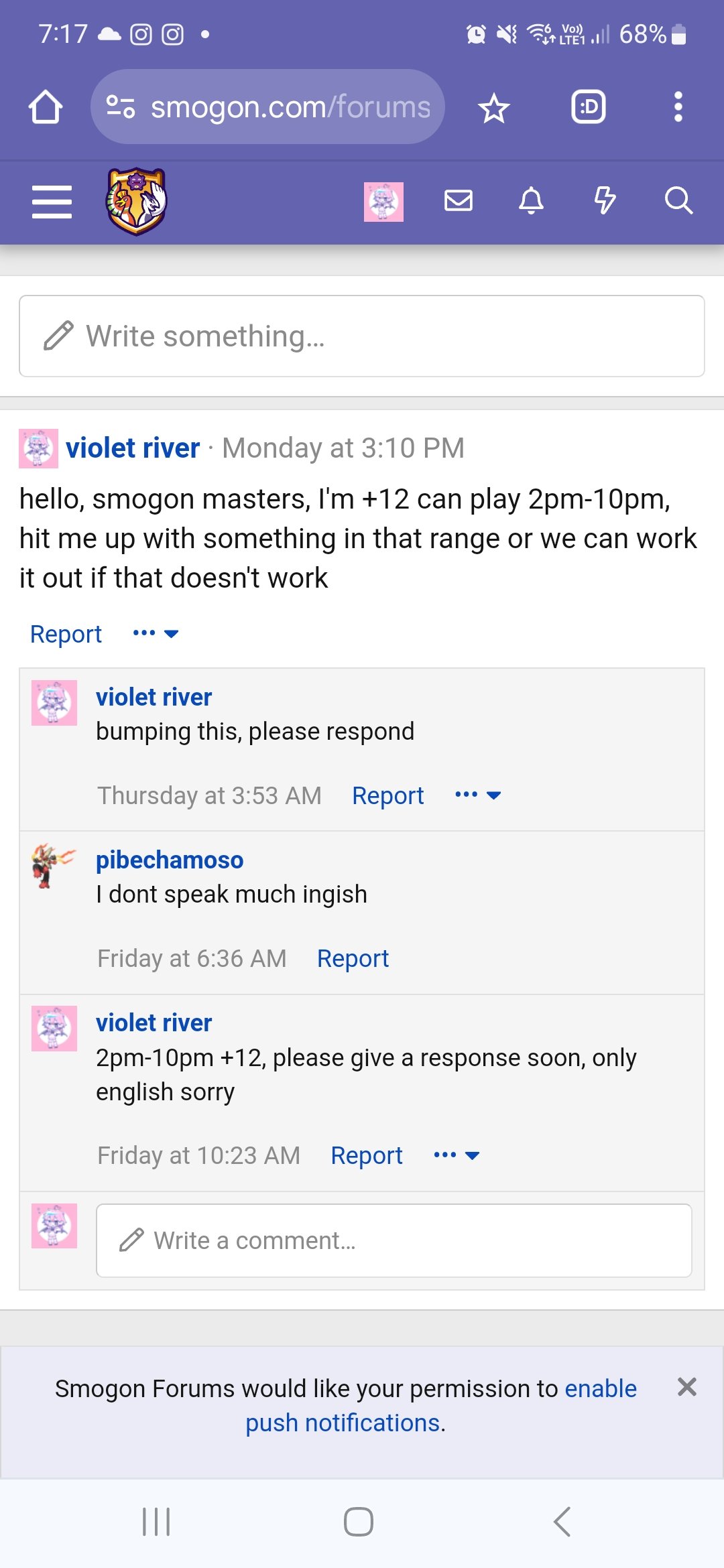 I'm sorry but I almost couldn't make it over the weekend, but we already fought.I didn't even confirm I could even make it that day or time. I was busy from Teusday to Thursday due to school and work, so I apolgize for responding late during the week, however the deadline is still the 29 and we still have time to play.