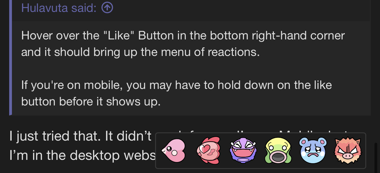 In the bottom right corner of the post, there is a "like" and a "reply" button. The like button opens up into different reaction emotes, while the reply button quotes the post like I've done to you here.How do I react to a message in a thread? I’m fairly new to smogon