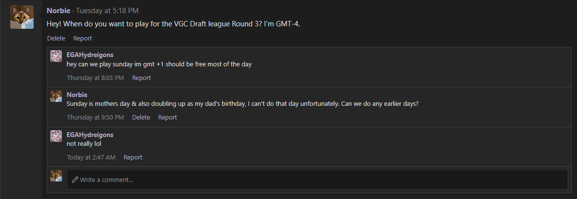 I'm going to go ahead and make an activity win request since we're almost out of time. My opponent has been in some contact, but never agreed upon a match time and was inactive in the period that they suggested.
