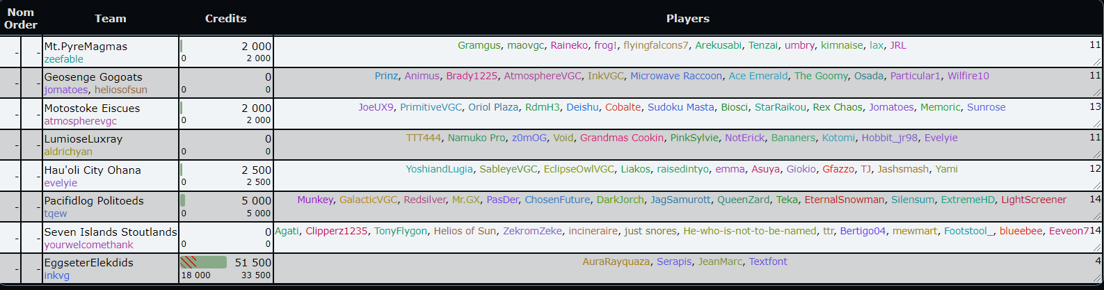 Let's get the elephant out of the room: the 34.5k on Namuko Pro was a bit ridiculous. Even with some good regional finishes in gen 6 and the more recent Players Cup dominance, that was 9k more than Agati, the next expensive player. Borghi and Aldrich then held on to just Namuko for a while, having everyone real curious what they were saving up for... only for it to be... DarkJorch? Yeah I'm really confused. Smogon players xtra and soulgazer were on Borghi's mind pretty early, but admittedly they're still mostly unproven besides some rumblings I hear on the ladder. PinkSylvie is the biggest name to follow Namuko Pro on this draft: she's very talented but there will be a lot of pressure on her to consistently perform, and probably assist the gen 7 slots too since she's been around. From here the Luxray are pretty much rounding out with decent to above average players in both gen 7 and gen 8, so it really to me feels like their run is dependent on some of these guys overperforming.