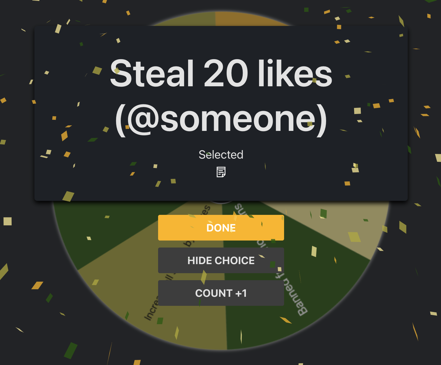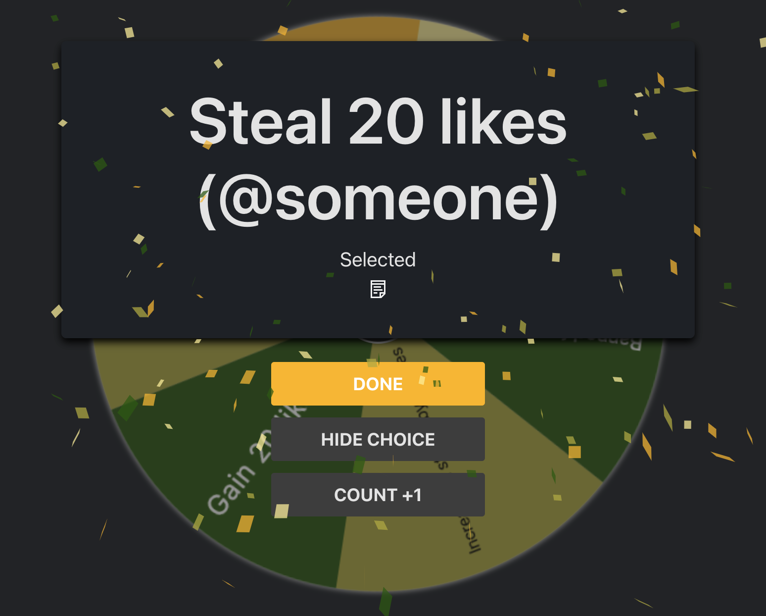 done (you just have to pretend I stole likes, because it's the only user I can't steal from)i will steal my likes from chaos also can i spin again pls (stop)