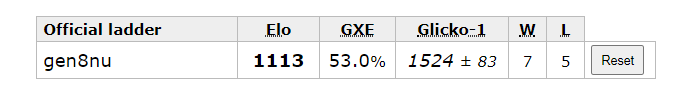 Hey, so this was my first week playing bots and it was pretty fun (except that one dude who just spammed ninjask and always haxed me). I played 2 games today and idk if that was allowed so i am going to post my score before today and then my score today.