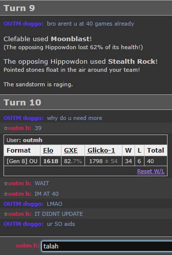 - All games must be played on the Pokemon Showdown! OU ladder on a new alt with the following format: "OUTM (nickname)" For example, I might register the alt OUTM Finch to ladder with.