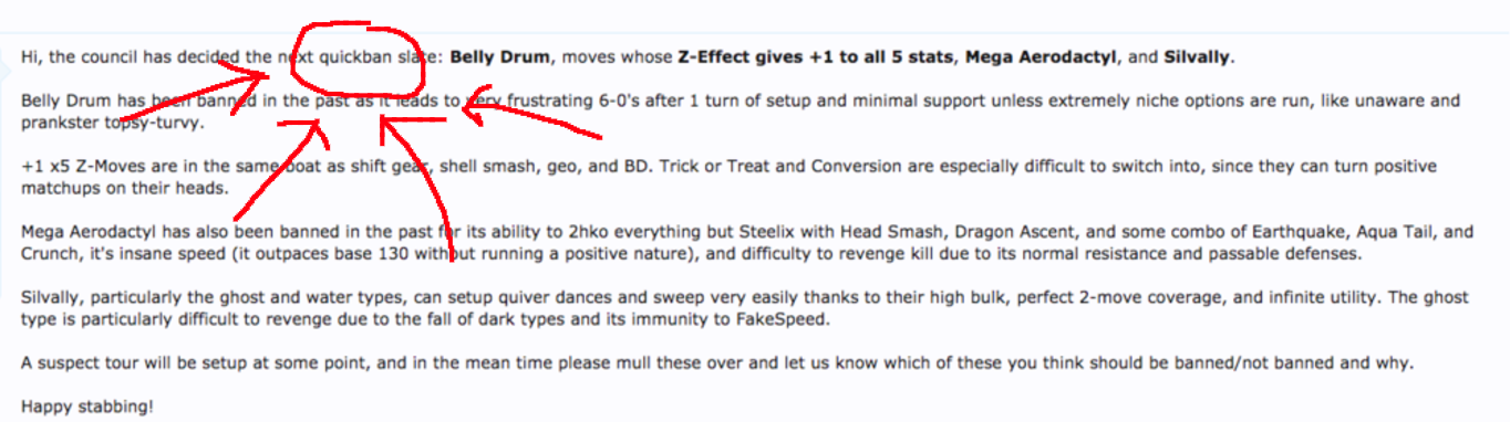 Hi, the council has decided the next quickban slate: Belly Drum, moves whose Z-Effect gives +1 to all 5 stats, Mega Aerodactyl, and Silvally.