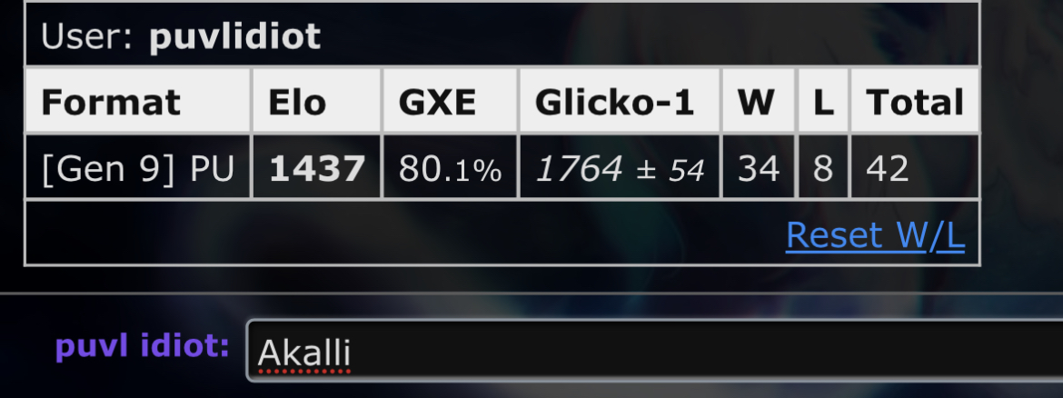 - All games must be played on the Pokemon Showdown! PU ladder on a fresh alt* (see below note) with the following format: "PUVL (Nick)." You must meet the listed format in order to qualify.