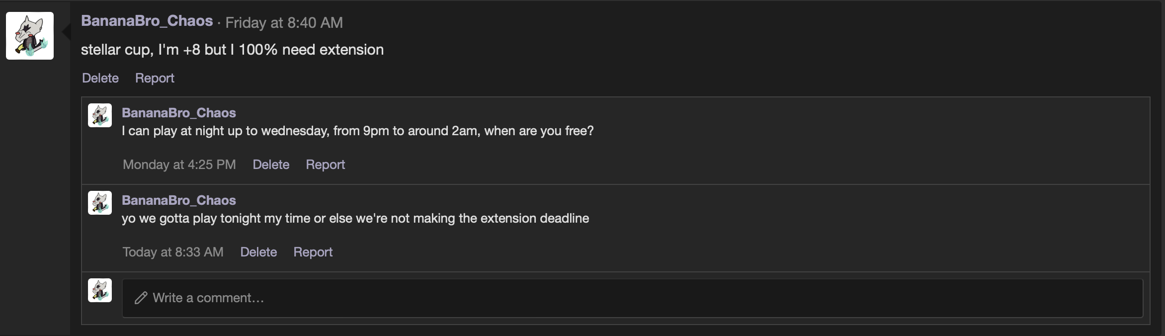 - When scheduling, offer as wide a swathe of time when you are available to play. 1 hour of activity on one or two weeknights is unlikely to be considered acceptable.