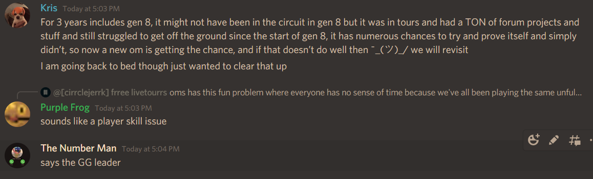 Again back to the first point, it's kind of hard to point to this as part of the issue when the main OMs are almost all at a notably lower activity level than they were last generation. However, I think that at the higher level of contributions for OMs, our main contributors generally do focus on the main OMs this generation rather than trying to submit new metagame ideas/projects