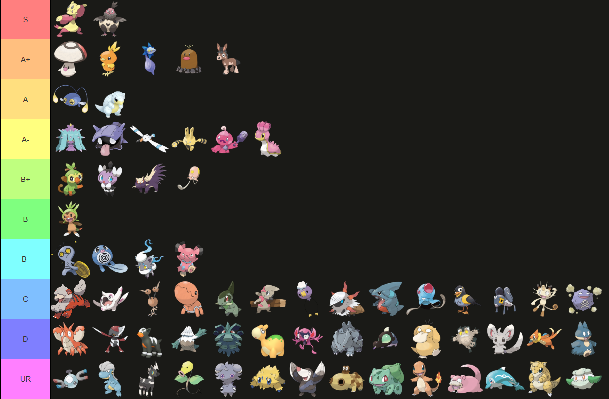 Notable Drops A+ to A+???: So even though I've left Mudbray in A+, I think it is no longer inarguably the 4th best mon in the tier like it has been for so long. There's enough of a gap between it and Foongus that I wanted to make this clarification, but it's still easier to slot onto teams than the 3 Cheapos of A Tier that it gets to stay. Just couldn't find a good enough reason to drop it, just a gut feeling that it feels worse.