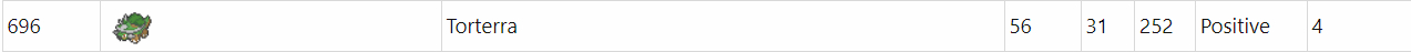 On that note, I believe the speed tier given for torterra is incorrect. 4 Boosts would indicate a 6x multiplier, putting it at 928 speed if its a positive nature, and not 696 as given in the table.