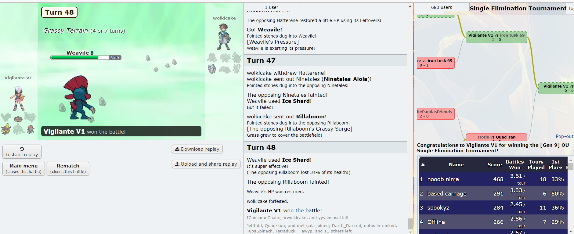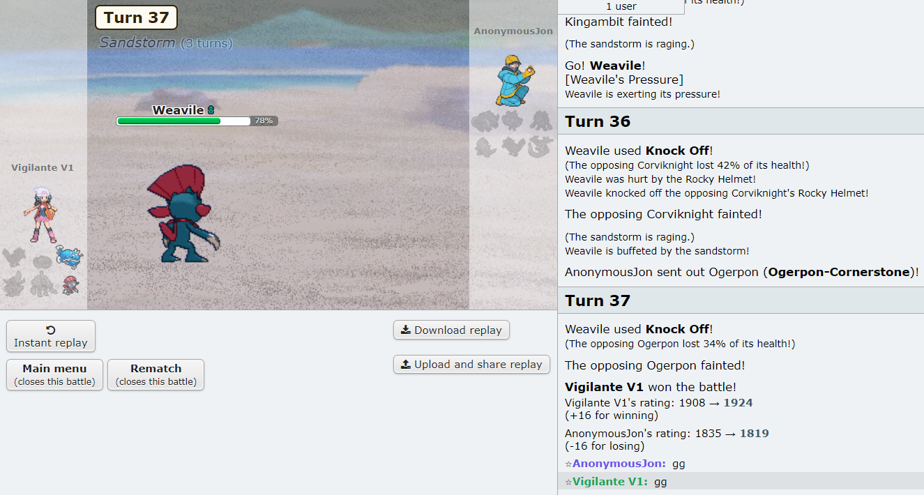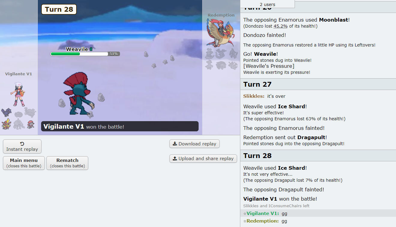 Below you can find some screenshots of recent matches were weavile was absolutely essential to the vicotry, most of the times it fills the role of late game cleaner. You can see it standing proudly in front of the teams he knock offed/ice sharded to oblivion:
