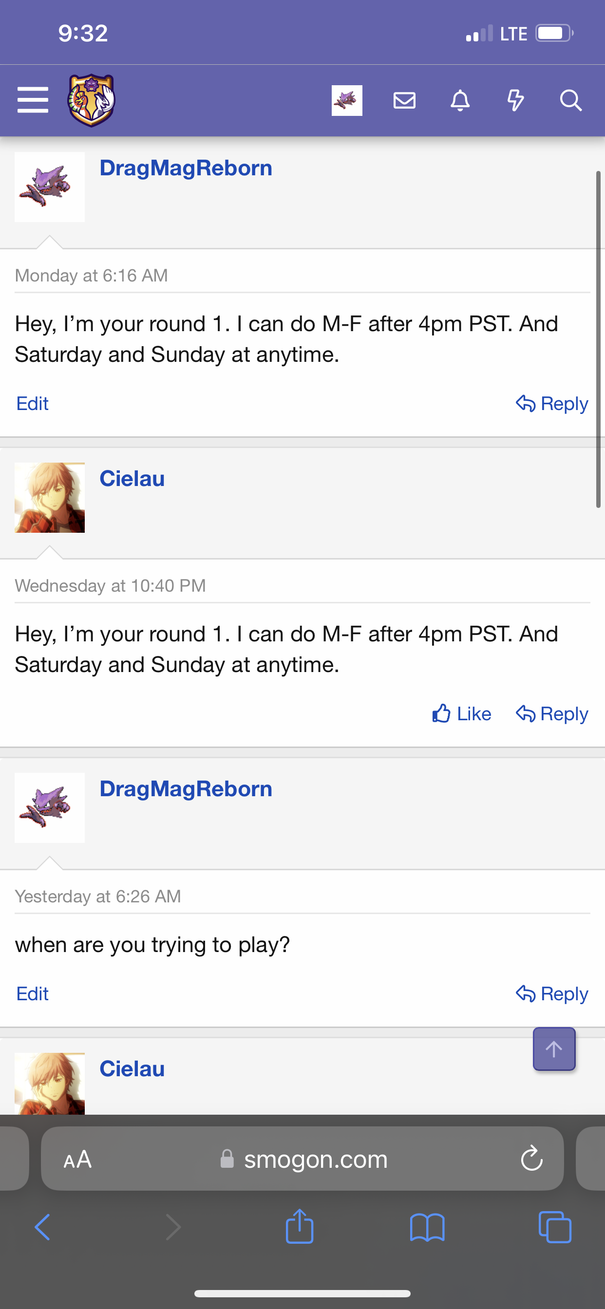 Calling act. Opponent and I agreed to this evening and they messaged me at noon. Been online on showdown and messaged them to let them know that since ~5 at specified time zone. Never got a response.