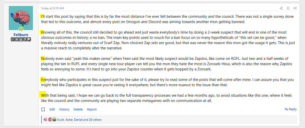 On the other hand, Zoroark-Hisui is extremely frail with 55/60/60 for defensive stats. Faster pokemon can easily revenge kill it, while non ghost or normal priority moves can pick it off as well. As mentioned before there are a decent amount of speciall walls that can come in on most moves as well: Umbreon, Goodra-Hisui, spdef Empoleon, AV Cyclizar, Wo-Chien, and Chansey. Zoroark-Hisui requires some skill to use as well. Disguising it as the right pokemon and bringing it in at the right time isn't always easy, especially when hazards are up which might give away its true identity.Ultimately, Zoroark often leaves the players guessing who is who, thinking about one threat, only to be caught off guard later. This guessing game is in favor of the Zoroark user, as losing the wrong defensive piece can open up the opponent to another offensive threat. This, together with its ability to overcome its checks in deceptive ways, leads the tiering council to deem Zoroark-Hisui worthy of a suspect test.