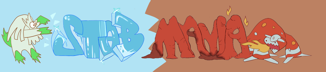 Art Direction:the Words STAB Mania One looking like Ice, the other looking like Lava with a Fire/Ice Pokémon looking smug either side of the words as if to show that they'd froze/created lava pools which formed the words from their STAB attacks.